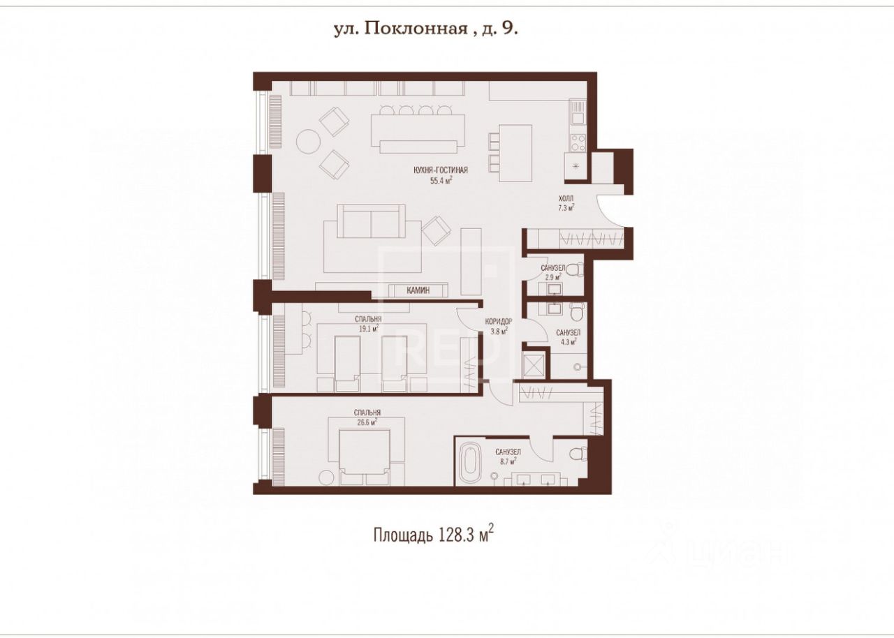 Арт. 132213646 Видовые евро 3-комнатные апартаменты общей площадью 128,2 м.кв. с дизайнерским ремонтом и оснащением в премиальном жилом комплексе "Поклонная 9".