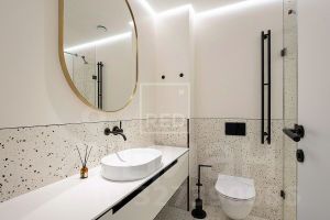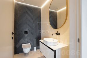 В отделке стен использован натуральный шпон, на полу натуральный камень, инженерная доска, установлена приточно-вытяжная система вентиляции, смесители DORNBRACHT (Германия), итальянский санфаянс премиального бренда Catalano. На кухне встроенная премиальная техника Asko, Smeg, стальная раковина, японский измельчитель Omoikiri; фильтры для очистки воды, светильники Fabian и Flos (Италия).
