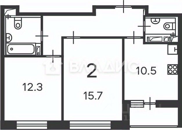 Площадь и планировка: Общая площадь квартиры составляет 54,4 кв. м, из которых 28 кв. м — жилая площадь. Две изолированные комнаты (15,7 кв. м и 12,3 кв. м) и кухня площадью 10,5 кв. м создают комфортные условия для жизни. Два раздельных санузла добавляют удобства для всех членов семьи.