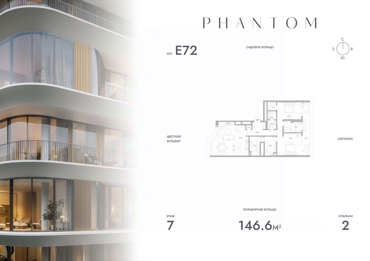Представляем просторную 2-комнатную квартиру на 7 этаже Резиденций PHANTOM. Общая площадь лота составляет 146.6 кв.м. и включает мастер-спальню с собственной ванной, большую кухню-гостиную и гостевой санузел.