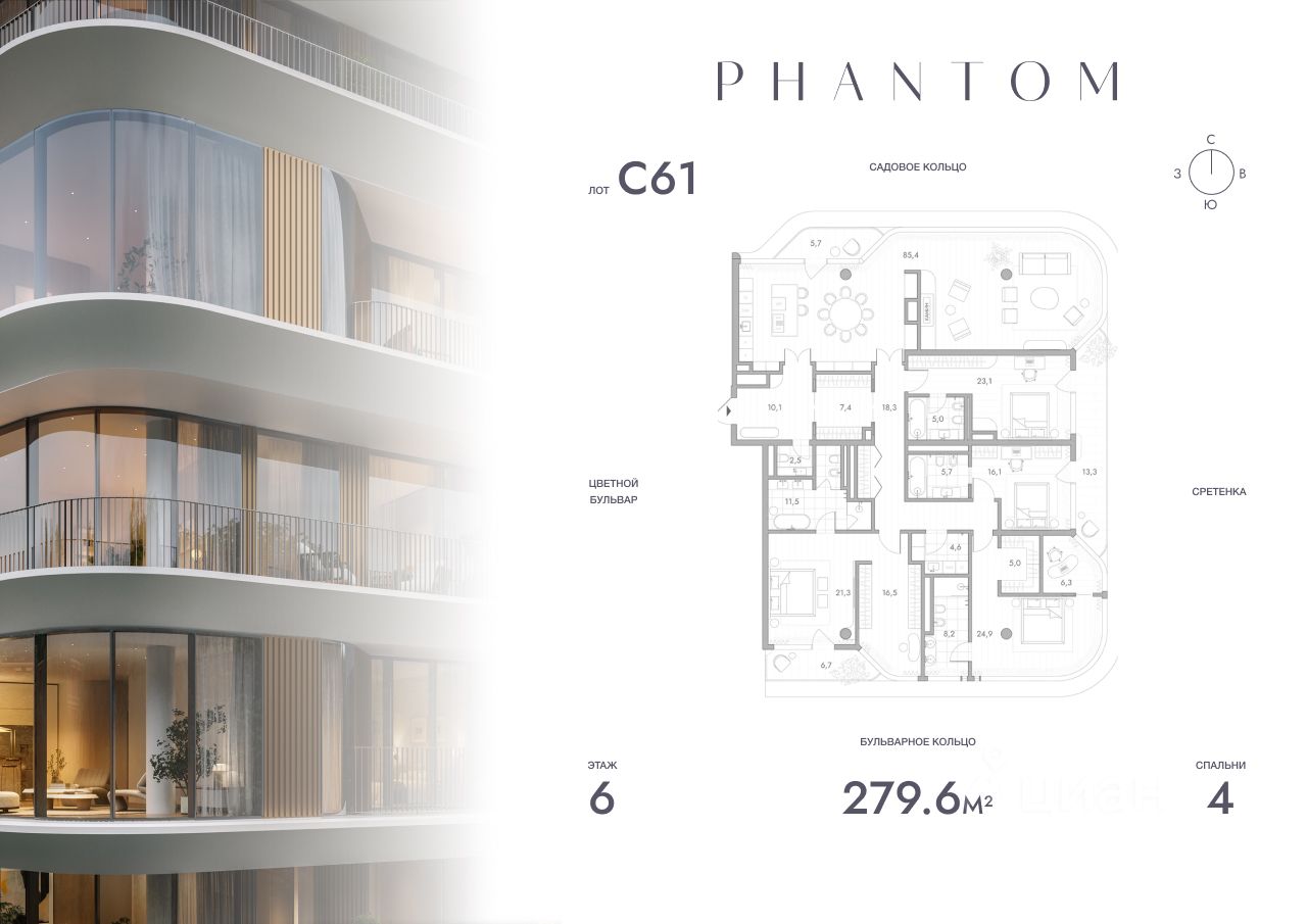 Представляем просторную 4-комнатную квартиру на 6 этаже Резиденций ФАНТОМ. Общая площадь лота составляет 279.6 кв.м. и включает мастер-спальню с собственной ванной, большую кухню-гостиную и гостевой санузел.