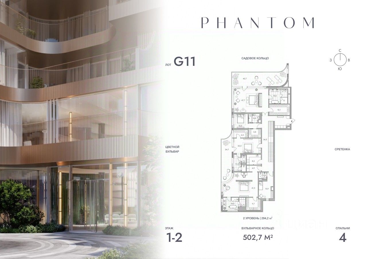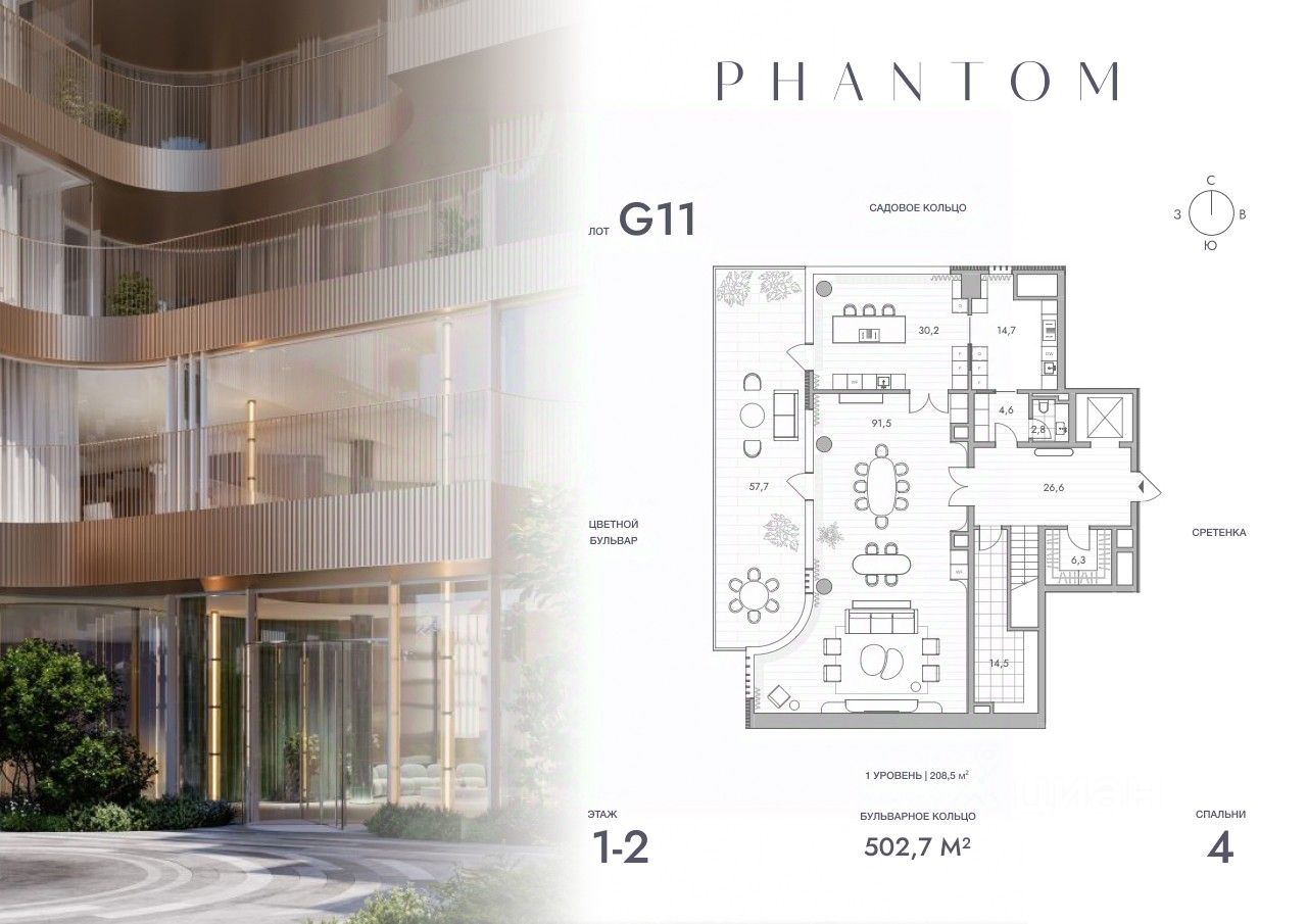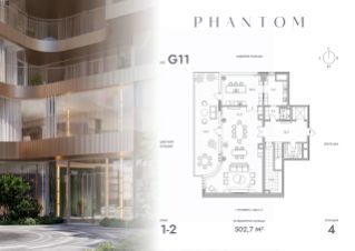 Представляем просторную 4-комнатную квартиру на 1 этаже Резиденций PHANTOM. Общая площадь лота составляет 502.7 кв.м. и включает мастер-спальню с собственной ванной, большую кухню-гостиную и гостевой санузел.