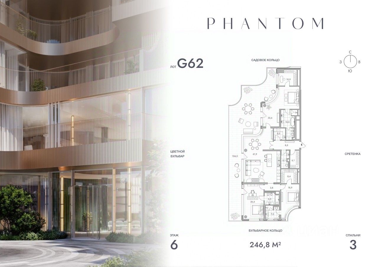 Представляем просторную 3-комнатную квартиру на 6 этаже Резиденций ФАНТОМ. Общая площадь лота составляет 246.8 кв.м. и включает мастер-спальню с собственной ванной, большую кухню-гостиную и гостевой санузел.
