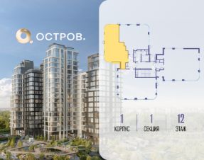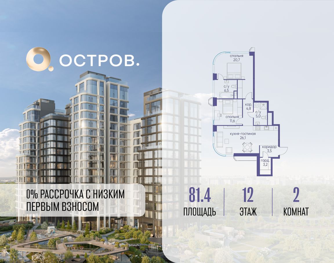 Продаётся 2-комн. квартира от застройщика: общая площадь 81.40 м², жилая 32.30 м², кухня 26.10 м², 12-й этаж, жилой квартал "Остров 12", корпус 1 (секция 1). Срок сдачи: 1 квартал 2029 года.