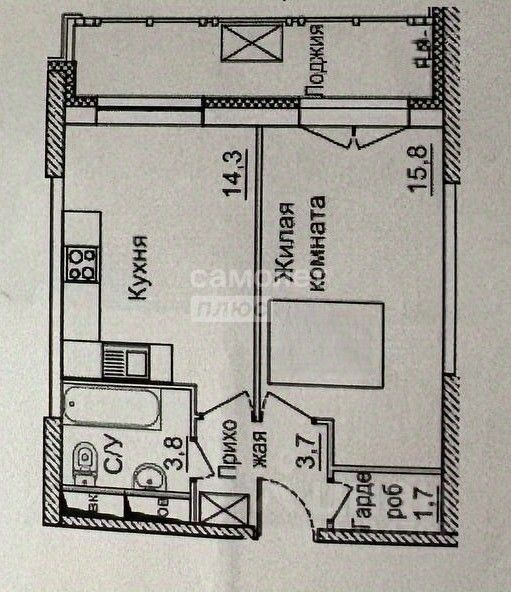 Планировка: комната 16 м², кухня 14,5 м², гардеробная 1,7 м², лоджия 7.2 м²