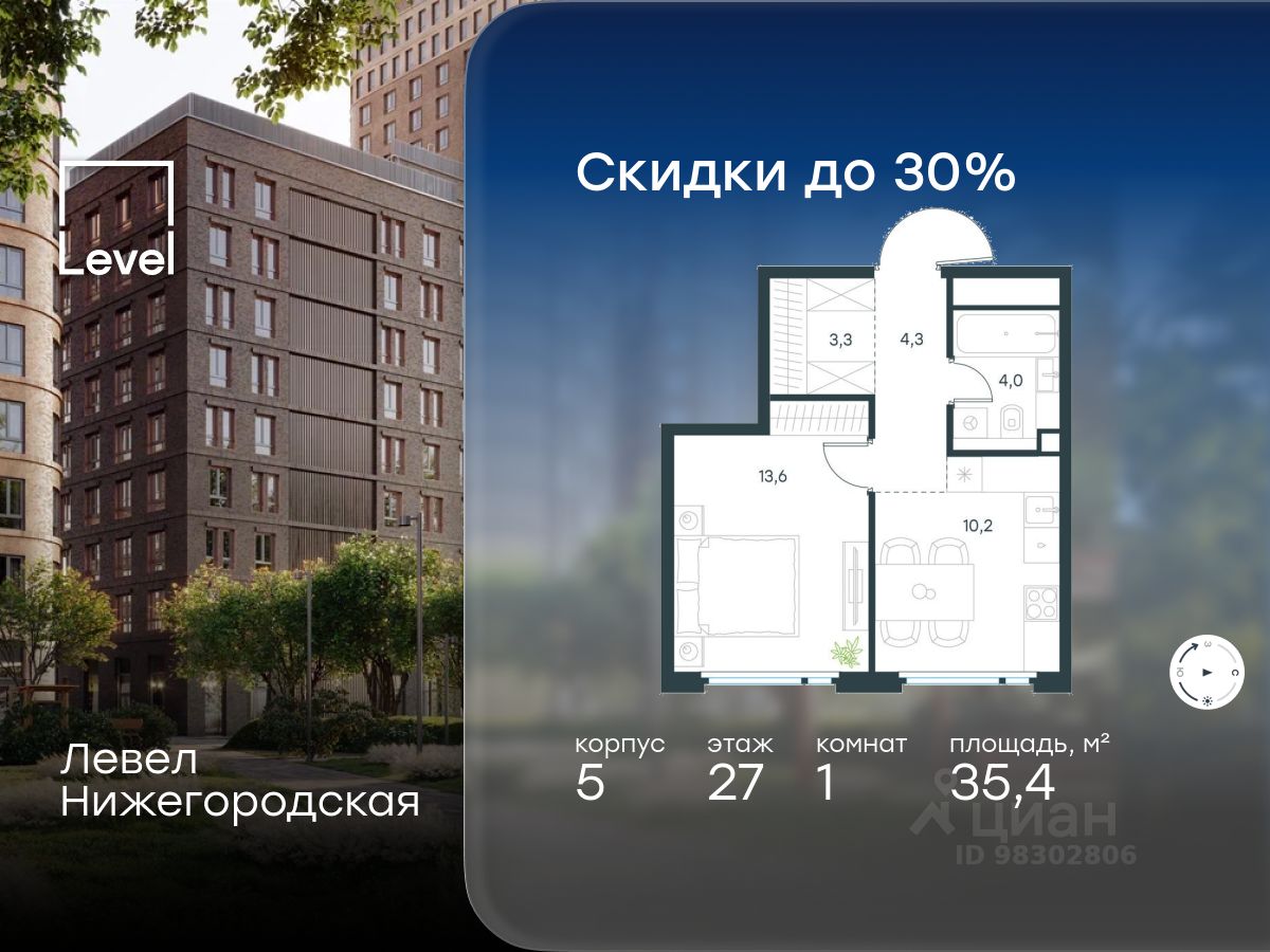 В активно развивающемся районе на юго-востоке столицы продается 1-комнатная квартира площадью 35,4 кв.м с отделкой "white box".. Квартира расположена на 27 этаже 29-этажного этажного корпуса 5 в жилом комплексе комфорт-класса Левел Нижегородская (компания Level Group/Левел групп).