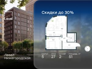 В активно развивающемся районе на юго-востоке столицы продается 2-комнатная квартира площадью 51 кв.м с отделкой "white box".. Квартира расположена на 27 этаже 29-этажного этажного корпуса 5 в жилом комплексе комфорт-класса Левел Нижегородская (компания Level Group/Левел групп).