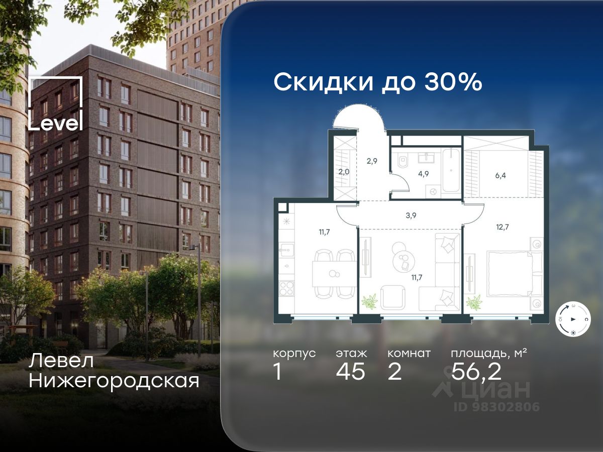 В активно развивающемся районе на юго-востоке столицы продается 2-комнатная квартира площадью 56,2 кв.м без отделки.. Квартира расположена на 45 этаже 45-этажного этажного корпуса 1 в жилом комплексе комфорт-класса Левел Нижегородская (компания Level Group/Левел групп).