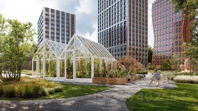 Вся площадь двора-парка будет огорожена и составит более 2 га, из которых 45% - озеленение. Одним из самых важных ландшафтных элементов здесь станет небольшая речка, наполняющаяся во время дождя. Вокруг неё появится сеть из островов, внутри которых расположатся тематические зоны спорта и отдыха.
