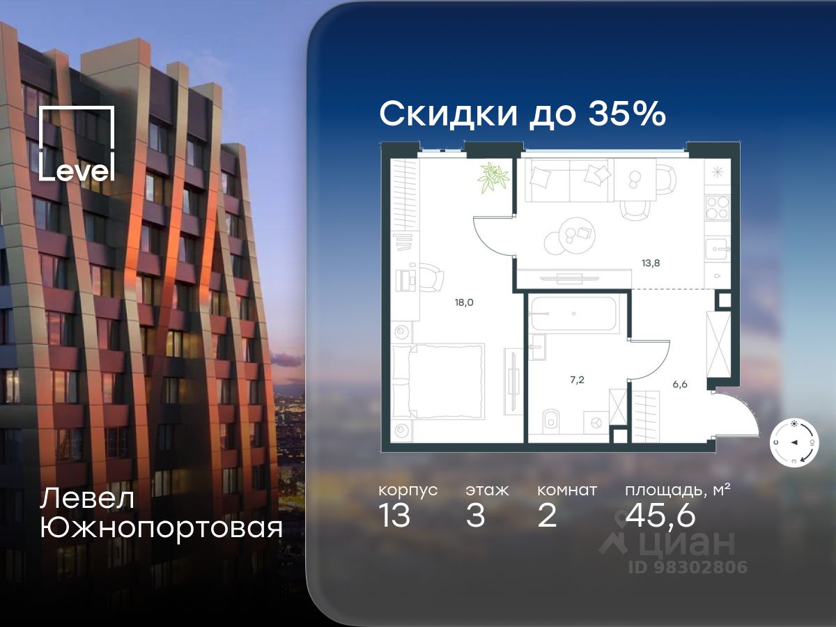 В северной части района Печатники продается 2-комнатный апартамент площадью 45.60 кв.м без отделки. Апартаменты расположены на 3 этаже 23-этажного корпуса 13 в жилом комплексе комфорт-класса Левел Южнопортовая (компания Level Group/Левел групп).