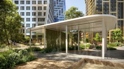 Вся площадь двора-парка будет огорожена и составит более 2 га, из которых 45% - озеленение. Одним из самых важных ландшафтных элементов здесь станет небольшая речка, наполняющаяся во время дождя. Вокруг неё появится сеть из островов, внутри которых расположатся тематические зоны спорта и отдыха.