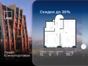 В северной части района Печатники продается 1-комнатная квартира площадью 35.70 кв.м без отделки. Квартира расположена на 6 этаже 20-этажного корпуса 12 в жилом комплексе комфорт-класса Левел Южнопортовая (компания Level Group/Левел групп).