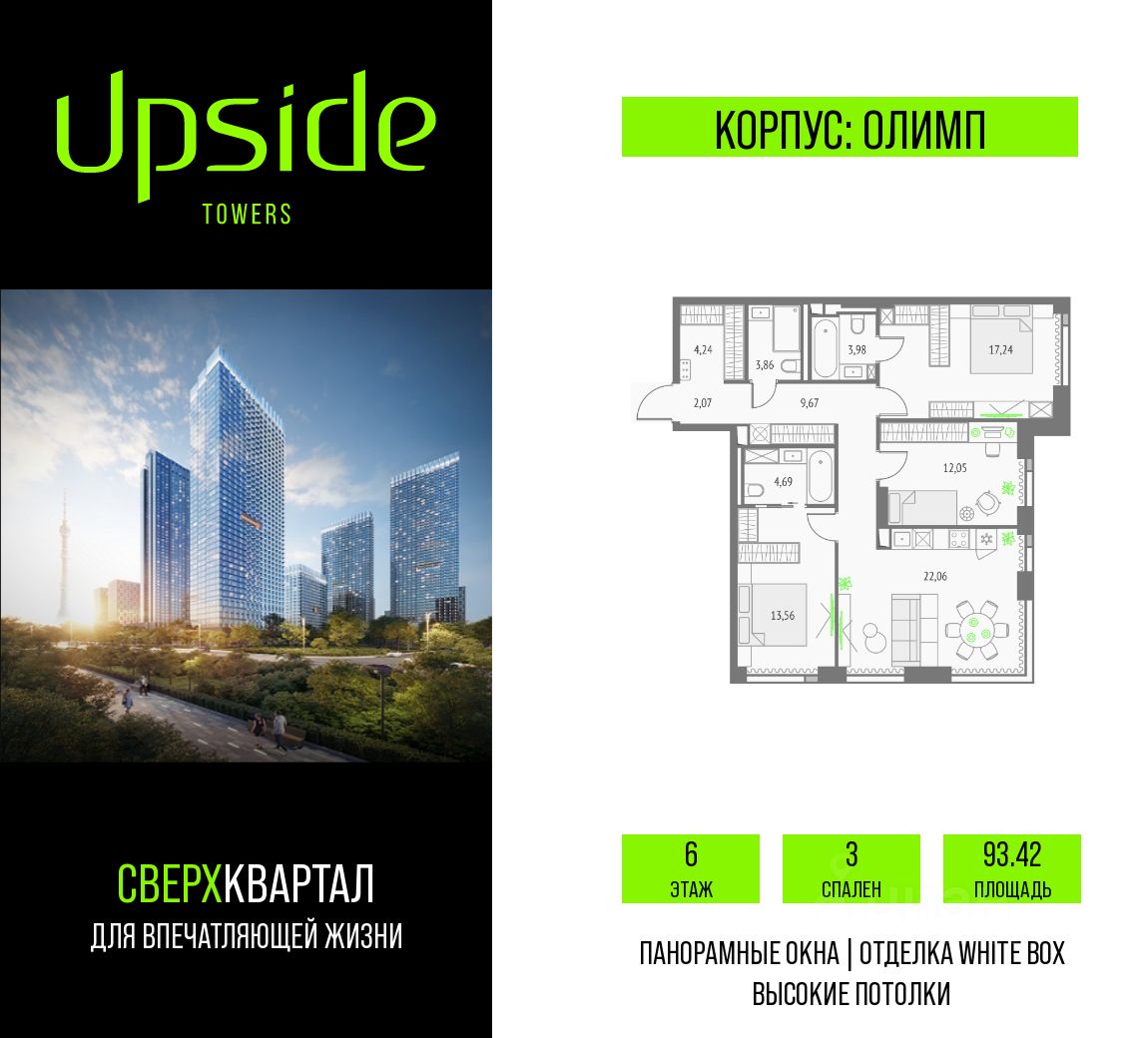 Продаётся 3-комнатная квартира площадью 93.42 кв.м на 6 этаже 19 этажного корпуса Олимп в квартале небоскребов "Апсайд Тауэрс", в квартире предчистовая отделка, c видом на корпус Монте Бьянко, корпус Эверест, внутренний двор, ландшафтный парк. Номер квартиры В0607.