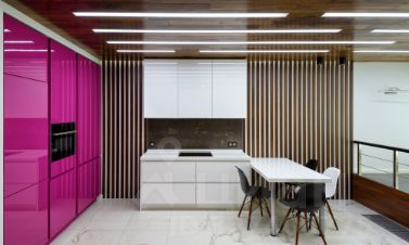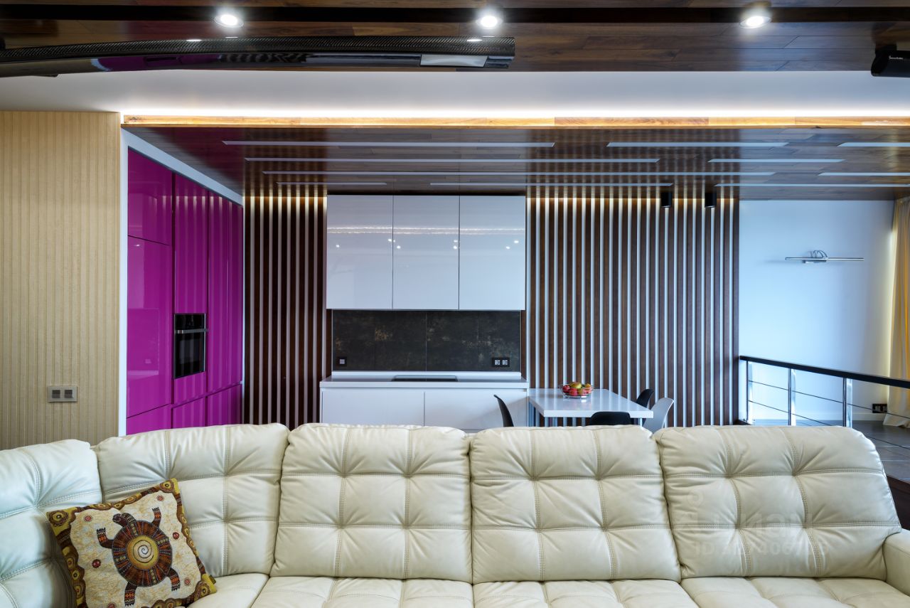 Гостиная (~50 м²) как центр притяжения: кухня, обеденная зона и мягкий уголок. Панорамное остекление, виды на город и закаты. Стены с отделкой деревом дают эффект загородного дома в городе. Подиум-трансформер: рабочее место, чтение или детские игры. В кухне Miele и Neff, продуманное хранение, измельчитель в мойке всё под рукой и ничего лишнего в поле зрения.