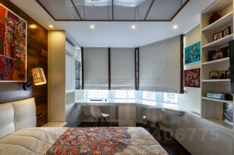 Мастер-спальня: большой шкаф с разделением на мужскую и женскую половину, два полноценных рабочих места, встроенная скрытая библиотека, собственный санузел с душем.