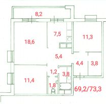 Площадь помещений без лоджии 69,2 м². Жилая площадь 41,3 м² (комнаты 18,6 + 11,4 + 11,3). Кухня 7,5 м².