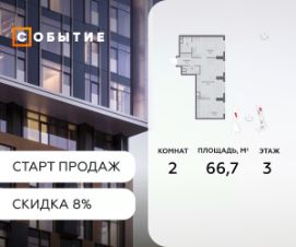 В продаже 2-к квартира от застройщика. Общая площадь 66.7, жилая 24.7, кухня 42. Квартира расположена на 3 этаже жилого квартала "Событие-6", корпус 1, Секция 1. Квартира без отделки. Срок сдачи: 4 кв. 2029 года.