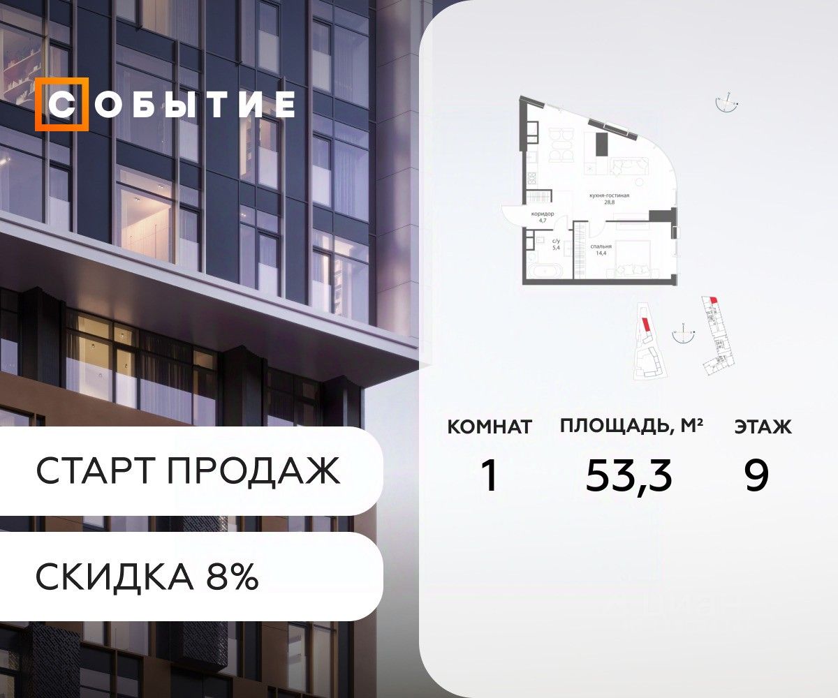 В продаже 1-к квартира от застройщика. Общая площадь 53.3, жилая 28.8, кухня 24.5. Квартира расположена на 9 этаже жилого квартала "Событие-6", корпус 1, Секция 1. Квартира без отделки. Срок сдачи: 4 кв. 2029 года.