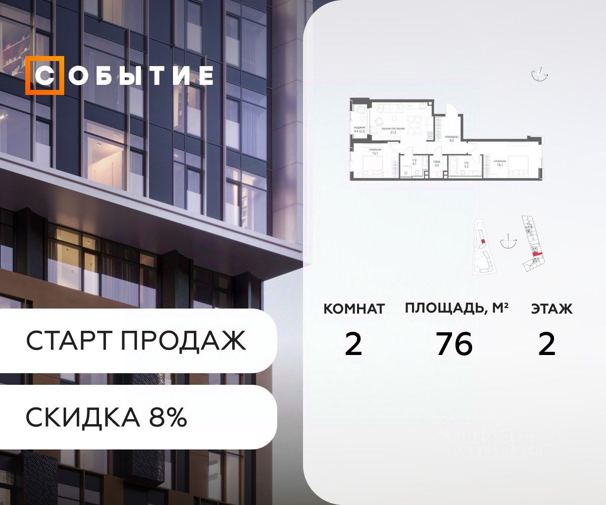 В продаже 2-к квартира от застройщика. Общая площадь 76, жилая 21.2, кухня 54.8. Квартира расположена на 2 этаже жилого квартала "Событие-6", корпус 1, Секция 2. Квартира без отделки. Срок сдачи: 4 кв. 2029 года.
