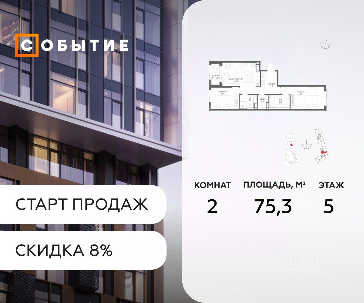 В продаже 2-к квартира от застройщика. Общая площадь 75.3, жилая 20.7, кухня 54.6. Квартира расположена на 5 этаже жилого квартала "Событие-6", корпус 1, Секция Секция 2. Квартира без отделки. Срок сдачи: 4 кв. 2029 года.