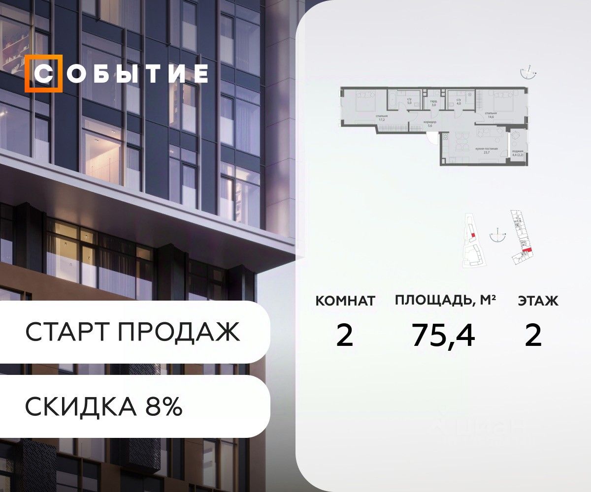 В продаже 2-к квартира от застройщика. Общая площадь 75.4, жилая 23.7, кухня 51.7. Квартира расположена на 2 этаже жилого квартала "Событие-6", корпус 1, Секция Секция 3. Квартира без отделки. Срок сдачи: 4 кв. 2029 года.