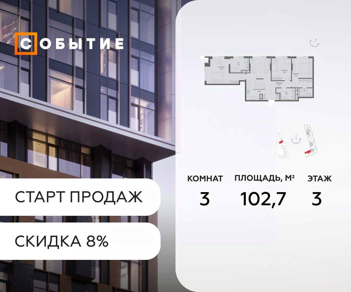 В продаже 3-к квартира от застройщика. Общая площадь 102.7, жилая 26.9, кухня 75.8. Квартира расположена на 3 этаже жилого квартала "Событие-6", корпус 1, Секция Секция 3. Квартира без отделки. Срок сдачи: 4 кв. 2029 года.