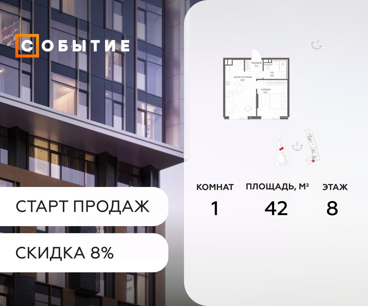 В продаже 1-к квартира от застройщика. Общая площадь 42, жилая 20.1, кухня 21.9. Квартира расположена на 8 этаже жилого квартала "Событие-6", корпус 1, Секция 3. Квартира без отделки. Срок сдачи: 4 кв. 2029 года.