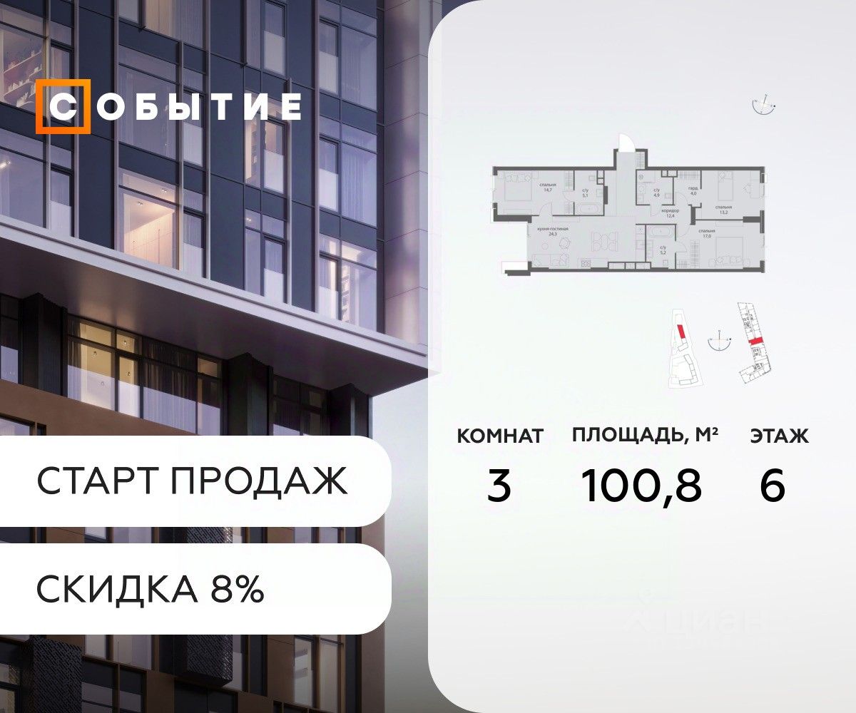В продаже 3-к квартира от застройщика. Общая площадь 100.8, жилая 24.3, кухня 76.5. Квартира расположена на 6 этаже жилого квартала "Событие-6", корпус 1, Секция 1. Квартира без отделки. Срок сдачи: 4 кв. 2029 года.