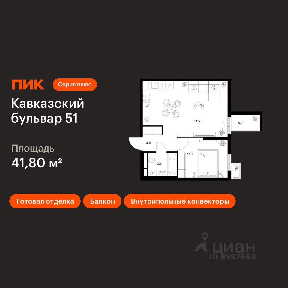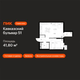 Продаётся 1-комн. квартира площадью 41,8 кв.м на 4 этаже 23 этажного дома (Корпус 3.3, Секция 3) проекта ПИК Кавказский бульвар 51. Светлый просторный подъезд на уровне земли, функциональная планировка, большие окна, c отделкой.