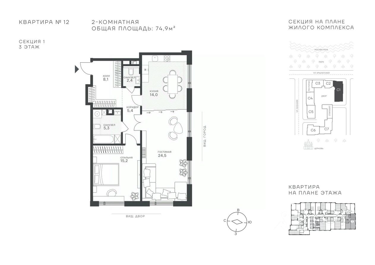 Продается 2-к квартира площадью 74.9 кв.м. на 3-м этаже в ЖК "Клубный квартал Крылатская 33". Прямая продажа от застройщика!
