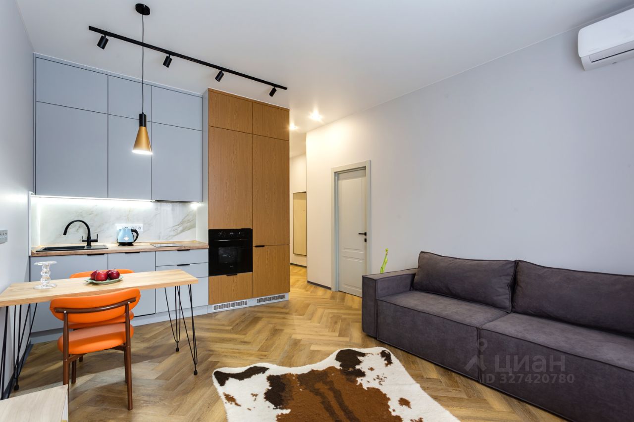 Планировка квартиры: кухня-гостиная, отдельная спальная комната, совмещённый санузел с ванной, гардеробная и прихожая. Высота потолков 3 метра.