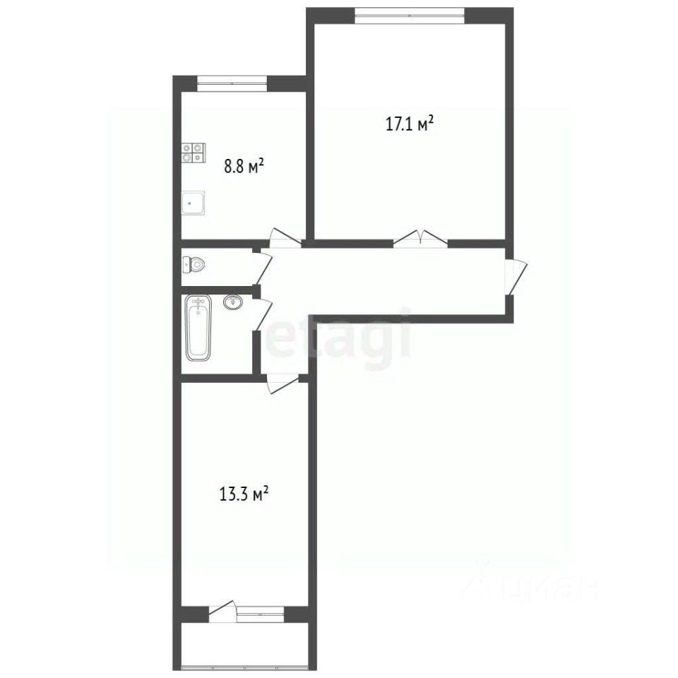 Практичная планировка с изолированными комнатами и кухней 9 м² обеспечивает комфортное проживание для семьи или пары.