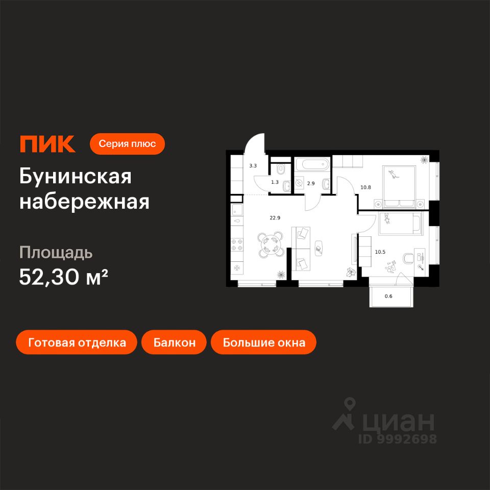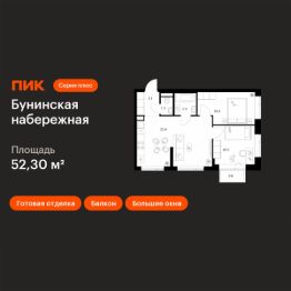Продаётся 2-комн. квартира площадью 52,3 кв.м на 12 этаже 16 этажного дома (Корпус 2.6/1.5, Секция 5) проекта ПИК Бунинская набережная. Светлый просторный подъезд на уровне земли, функциональная планировка, большие окна, c отделкой.