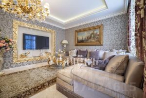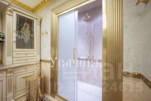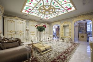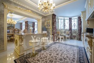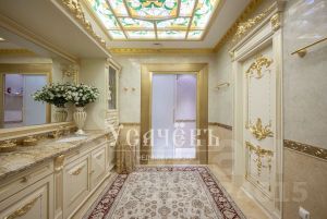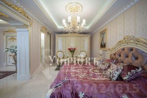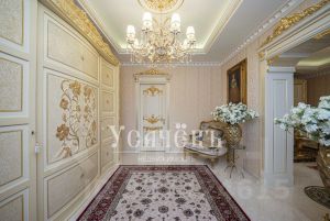 Полы из натурального мрамора, итальянская плитка и сантехника, позолоченные межкомнатные двери и мебель, потолочная мозаика, ковры ручной работы, итальянские шелковые обои, эксклюзивная мебель выполнена на заказ итальянскими мастерами, новая бытовая техника.