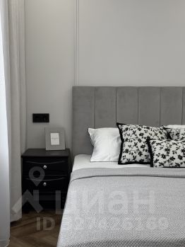 В спальне комфортная двуспальная кровать с мягким изголовьем, прикроватными тумбами и туалетным столиком и встроенным шкафом.