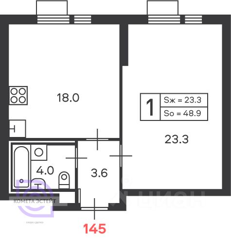 Общая площадь — 48.9 кв. м, жилая площадь — 23.3 кв. м, кухня — 18 кв. м.