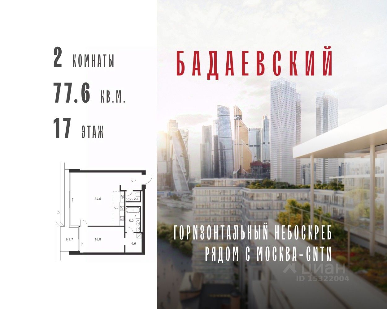 Продаётся 2-комнатная квартира общей площадью 77.60 м² на 17 этаже Жилого Комплекса Бадаевский.