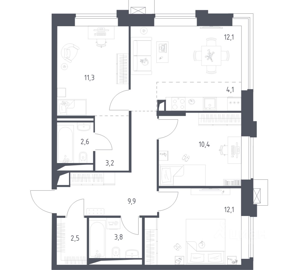 Строим кварталы для жизни с заботой о будущем. Предлагаются 3-комнатные апартаменты бизнес-класса площадью 71,93 кв.м в корпусе 3.1 на 6-м этаже, в жилом комплексе "Верейская 41".