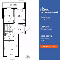 Продаётся 2-к квартира номер 329 общей площадью 51.5 кв.м. на 13-м этаже 14 этажного здания. Предчистовая отделка. Цена с учётом скидки.