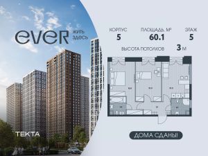 3-комн. квартира в ЖК "Ever" на 5 этаже в 34 этажном здании Корпус 5. Общая площадь: 60.1 кв.м., жилая: 41.9 кв.м. Высота потолков 3.00 м.