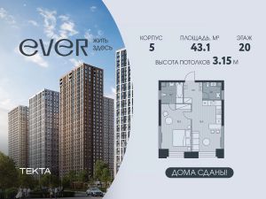 2-комн. квартира в ЖК "Ever" на 20 этаже в 34 этажном здании Корпус 5. Общая площадь: 43.1 кв.м., жилая: 26.3 кв.м. Высота потолков 3.15 м.