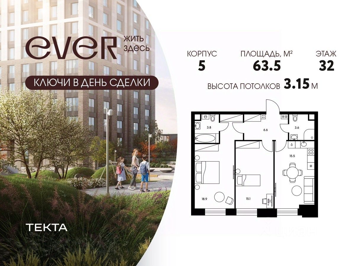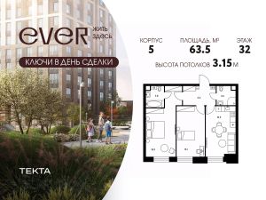 2-комн. квартира в ЖК "Ever" на 32 этаже в 34 этажном здании Корпус 5. Общая площадь: 63.5 кв.м., жилая: 34.0 кв.м. Высота потолков 3.15 м.