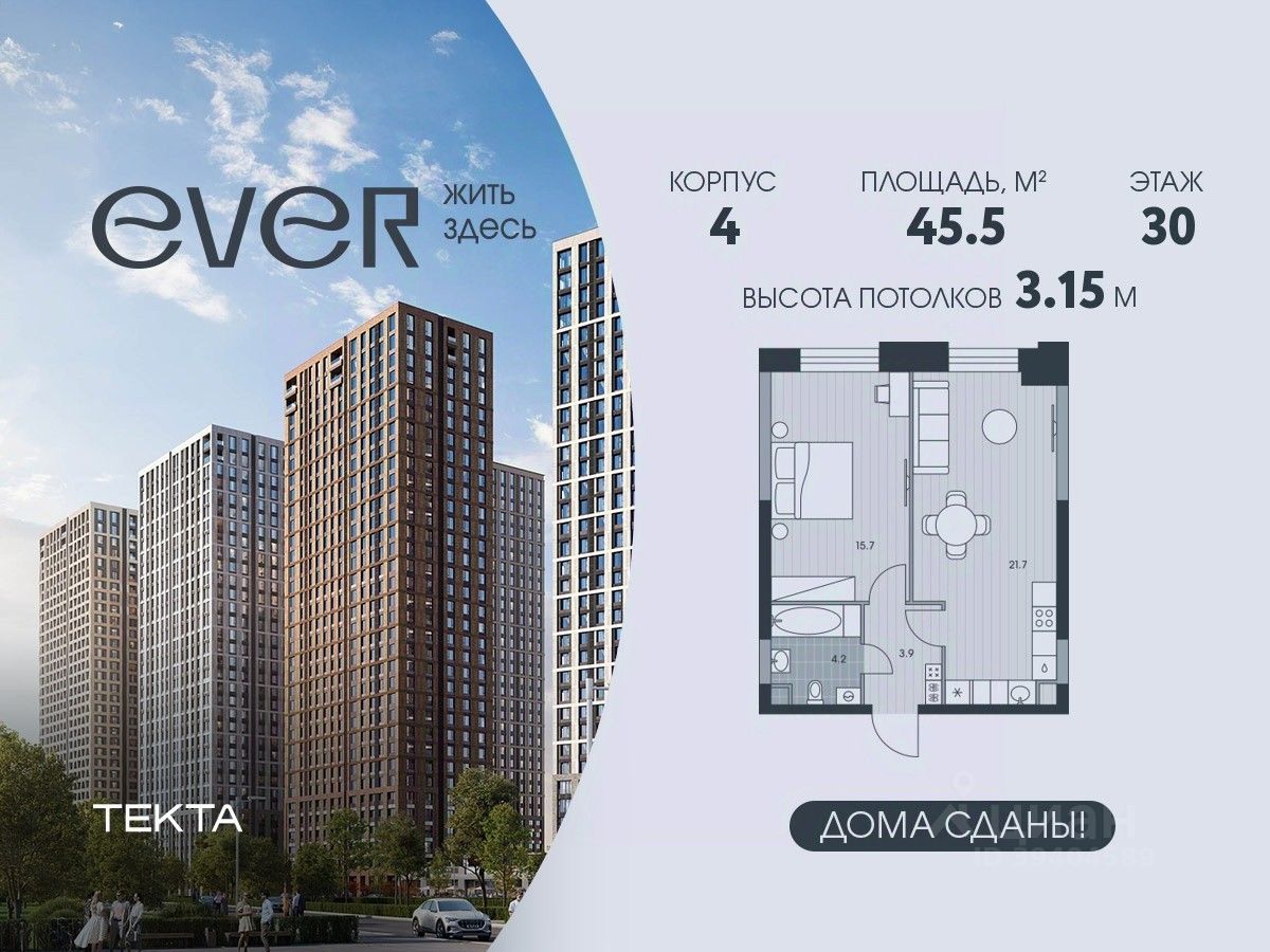 2-комн. квартира в ЖК "Ever" на 30 этаже в 34 этажном здании Корпус 4. Общая площадь: 45.5 кв.м., жилая: 31.9 кв.м. Высота потолков 3.15 м.