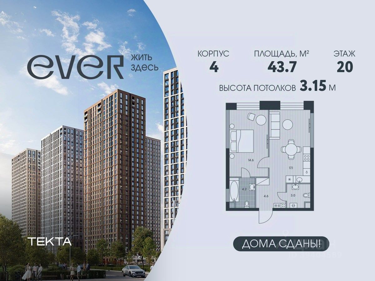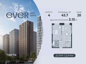 2-комн. квартира в ЖК "Ever" на 20 этаже в 34 этажном здании Корпус 4. Общая площадь: 43.7 кв.м., жилая: 25.6 кв.м. Высота потолков 3.15 м.