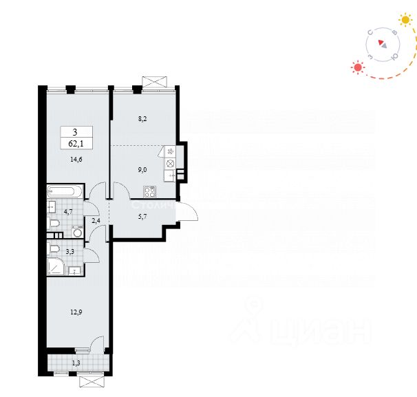 Арт. 132192318 Продается по переуступке евро 3х квартира, площадью 62,1 м2, в ЖК "Бунинские кварталы"!!!