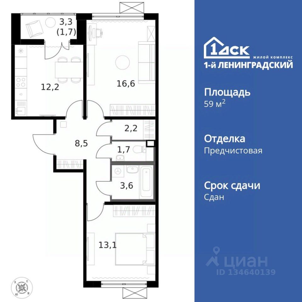 Продаётся 2-к квартира номер 505 общей площадью 59.6 кв.м. на 11-м этаже 14 этажного здания. Предчистовая отделка. Цена с учётом скидки.