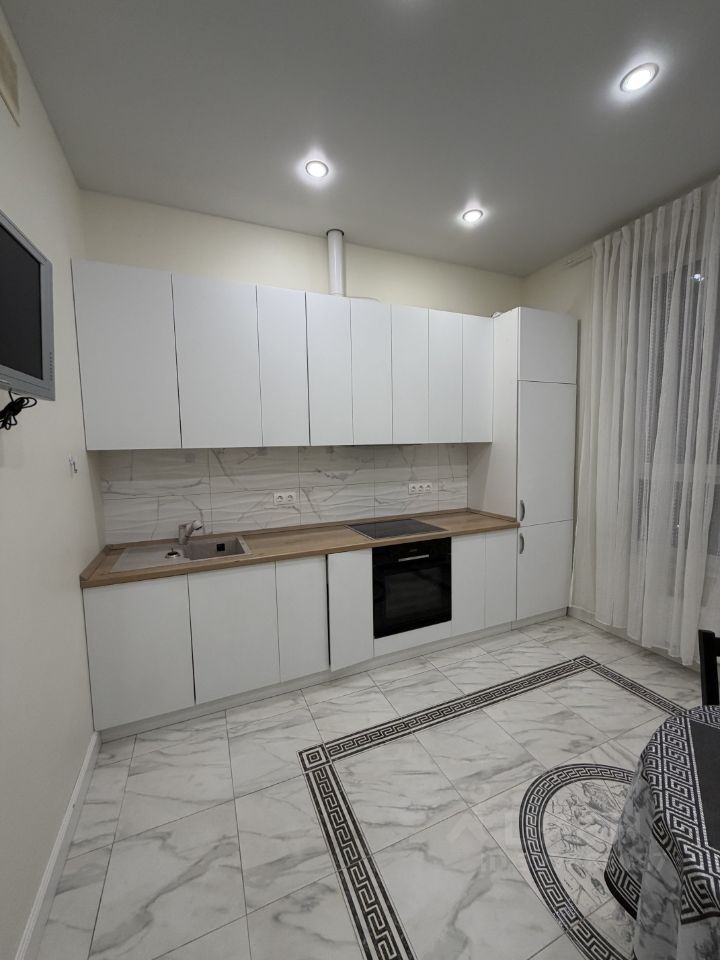 Большая, светлая кухня способна вместить просторный диван, холодильник встроенный, качественная техника.