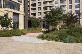 Квартал продуман до мелочей. В нём обустроен двор с газонами и прогулочными аллеями, видовыми площадками для отдыха с деревянными шезлонгами и перголами. Резиденты будут наслаждаться эффектной панорамой Москвы-реки с шестиметровой возвышенности стилобата.