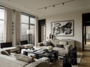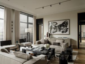 В интерьере — мебель мировых брендов Molteni & C., Augusto, Vincent Van Duysen. Установлена кухня Binova, барные стулья Baden Bar и Four Hands. Встроенная техника V-ZUG и Embers Lab отвечает самым высоким требованиям к качеству и эстетике. Здесь каждая деталь работает на ощущение цельности и статуса.