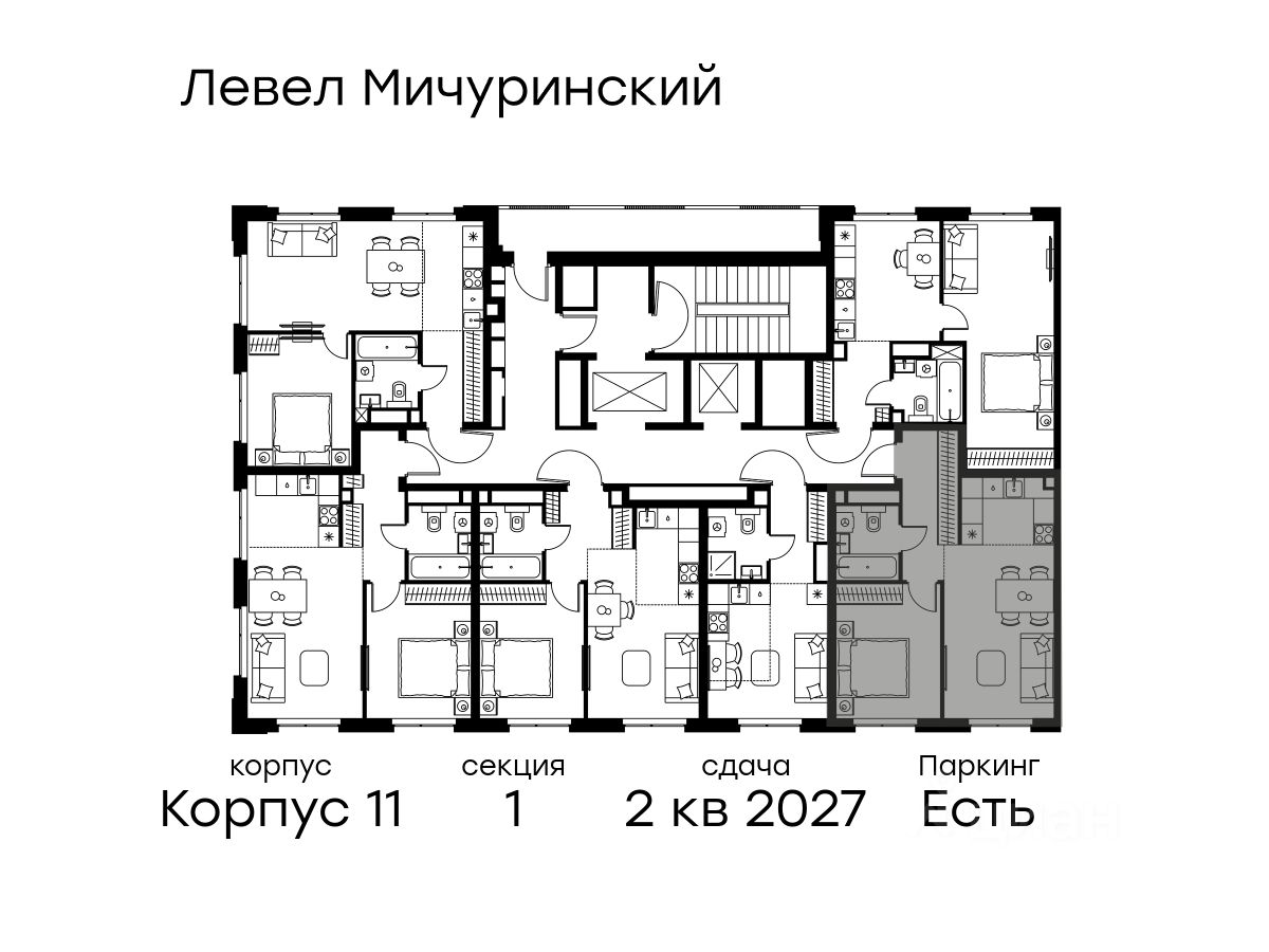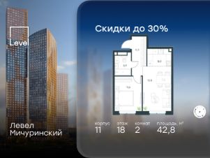 В жилом квартале, расположенном на границе с природным заказником "Долина реки Очаковки", продаётся 2-комнатная квартира площадью 42.80 кв.м с отделкой white box. Квартира расположена на 18 этаже 24-этажного корпуса 11 в жилом комплексе бизнес-класса Левел Мичуринский (компания Level Group/Левел групп).